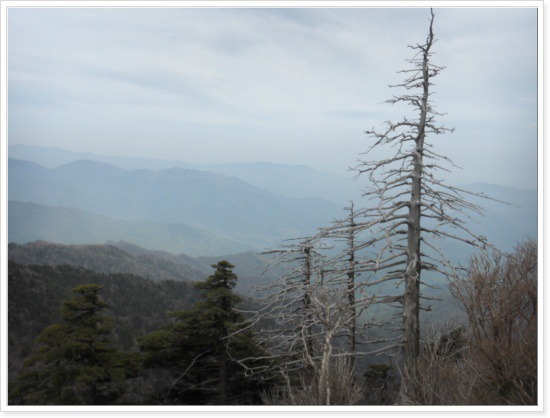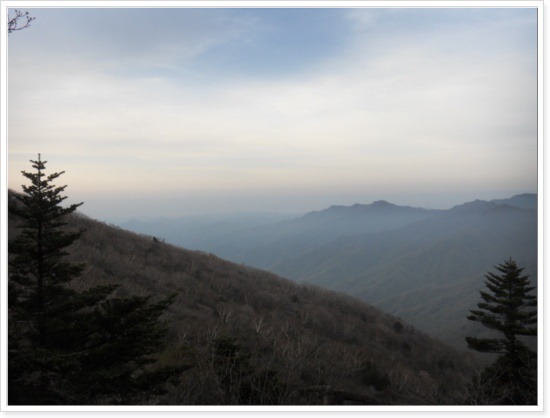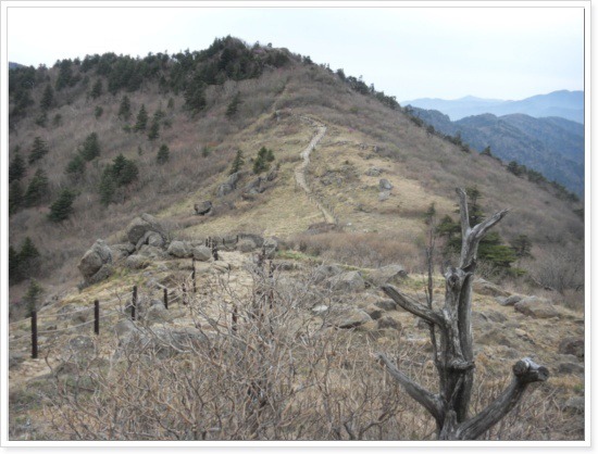 삼천포를 찾아보라는 전망대(6:45), 청학동 삼거리(7:05)를 지나고 나니 하늘이 열리고 멀리 촛대봉도 보입니다. 세석산장(7:15)은 쓰레기 천국이 되어버렸습니다. 단속을 않는 건지 허술한 건지 알 수 없지만 근본적인 문제는 산에 올라와서 버리는 행락꾼이지 국공의 문제는 아니라 생각합니다. 그런 행위를 하는 사람은 산님이 아니고 분명 행락꾼들입니다. 여기도 기온 탓으로 철쭉은 아직 멀었고 진달래가 막 몽우리만 맺고 있습니다.