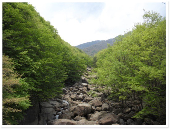 거림(4:43)을 출발하여 약 1.2Km 지점까지는 같이 가다 오이 한 쪼가리 얻어 먹고 추월하여 천팔교(5:50)를 지나고 북해도교(6:00)에 도착하니 어김없이 또 아랫배가 살살 꼬여옵니다. 물소리 우렁찬 계곡에 앉아 단팥빵과 새벽부터 맥주 한 깡통 비우고 있으니 한 사람의 산님이 살살 올라가고 있습니다. 백두대간으로 다져진 다리가 금방 그 산님을 따라 잡습니다. 광주의 전문대학에서 얘들 가리키는 것이 직업이라는 산님인데 보기보다 젊어 보입니다. 그 분은 천왕봉까지 동행하고 헤어져 대원사로 하산하였습니다.
