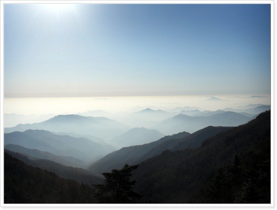 예의 어제 익숙했던 안동 동창의 목소리가 어둠 속에서 낭랑하게 들려옵니다. 천왕봉 일출을 보고 중산리로 하산하겠다며 무거운 배낭을 짊어지고 죽으라 올라가고 있습니다. 천왕봉 정상에는 발 디딜 틈조차 없을 정도로 많은 사람들이 올라 아침 찬바람을 피해 구석구석 웅크린 채 동쪽하늘만을 뚫어져라 응시하고 있습니다. 동부능선 너머 산 또 그 너머 산이 있고 사이사이 구름을 깔아놓은 새벽풍경 이것 하나만으로도 잠 설쳐가며 천왕봉에 올라온 값을 받습니다. 멀리 구름 수평선을 따라 붉은 띠의 여명이 밝아오고 있습니다. 많은 환호성과 함께 새날의 태양이 솟아 오릅니다. 지리산에 수태 올랐지만 오늘같이 멋있는 태양은 처음입니다. 어떤 이는 열번째 올라 처음으로 일출의 멋진 광경을 본다며 소원을 빌어야 된다는 둥 너무 감격해 합니다. 지리산이 내린 새로운 선물하나를 가슴에 담고 어둠으로 보지 못한 제석봉의 경치를 감상하며 천천히 장터목으로 발길을 돌렸습니다.