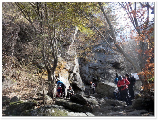 오늘은 세석산장을 들러지 않고 곧바로 한신계곡으로 하산하기로 했습니다. 정말 엄청난 가꼬막이 끊임없이 이어집니다. 내려가는 우리야 약간의 조심만 하면 되지만 올라오는 부부는 죽을 지경인 모양입니다. 오만상을 찌푸리는 아내의 얼굴은 다시는 신랑을 따라 산에 오지 않겠다는 표정입니다. 2년 전 여기로 올라오다 양다리 쥐라는 놈을 만나 식겁 먹은 적이 있는 곳이기도 합니다. 본격적인 한신계곡이 시작되었는지 졸졸 물 흐르는 소리가 들려오고 점점 계곡이 깊어집니다. 드디어 경쾌하게 물줄기가 쏟아지는 오층폭포가 나타나고 계곡을 건너는 나무 다리들이 여럿 나타납니다. 그냥 걷기만 한다면 지루하기 짝이 없는 계곡이지만 경치에 조금만 관심 갖는다면 정말 아름다운 계곡입니다. 수심을 가늠하기 힘든 가내소폭포는 한신계곡 최고의 명소이거늘 어느 생각없는 부부의 돼지고기 굽는 냄새가 천지를 진동해 서둘러 자리를 떠났습니다. 첫나들이폭포를 지나고나니 아직 끝내지 않은 백무동의 가을단풍 잔치판이 어제처럼 벌어져 있습니다. 시인의 마을에서 국립공원공단 직원들이 설문조사를 요청하여 동참하려고 펜을 들었는데 또 귀에 익은 목소리가 들립니다. 무슨 질긴 인연이 이렇게 징그럽도록 따라 다닌단 말입니까? 안동동창들이 또 거기에 있었습니다. 전혀 다른 시간에 다른 길로 걸었는데 일부러 약속이나 한듯이 딱 맞아 떨어진 겁니다. 참 별일이 다 있다 생각했습니다. 그냥 헤어지면 섭섭하니 하산주를 같이 하기로 하였습니다. 당연 꿀맛이었습니다.