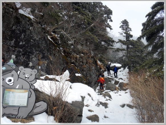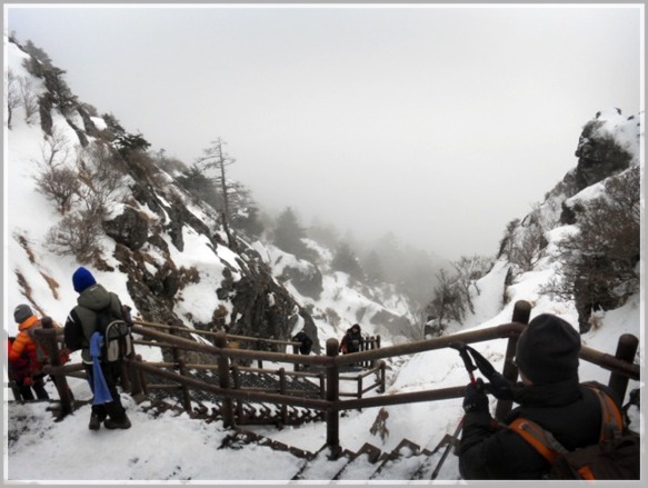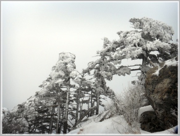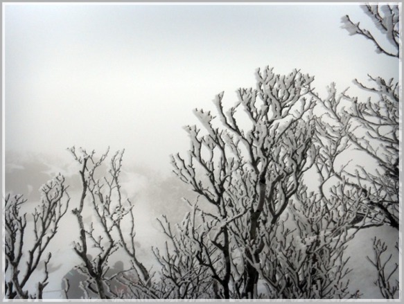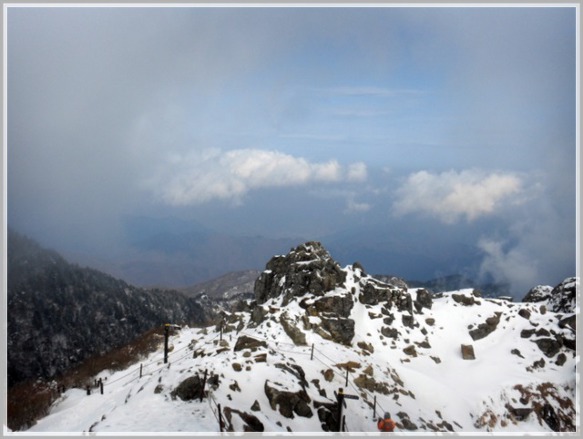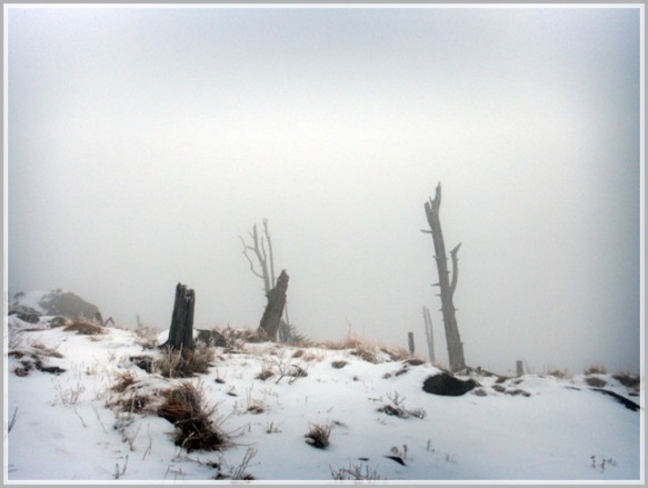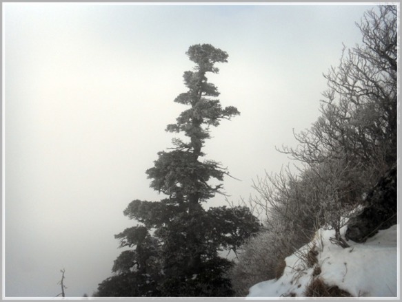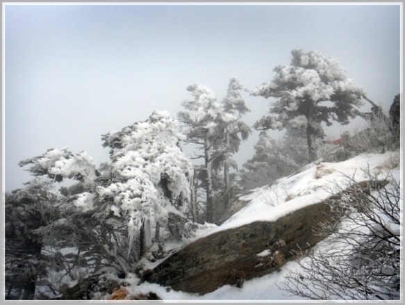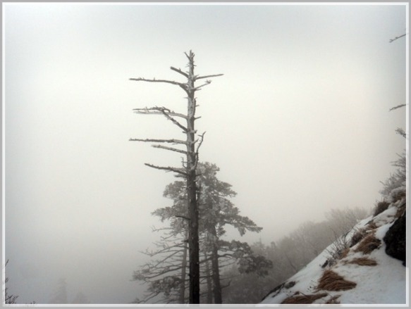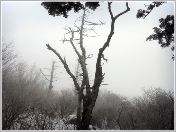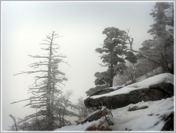 소지봉을 지나고서부터 는 길바닥이 미끄러워 아이젠을 착용해야하며 산 아래서는 그렇게 좋던 날씨가 상황이 완전 달라져 찬바람과 함께 운무가 춤을 춥니다. 언제나 그랬듯이 이번에도 마찬가지로 지리산은 날 실망시키지 않았습니다. 꽃이 피었습니다. 새로운 천 년을 꿈꾸는 고사목도 천만년을 한자리 지키는 바위도 하얀 꽃을 피우고 있습니다.