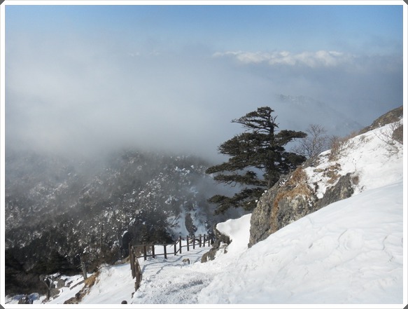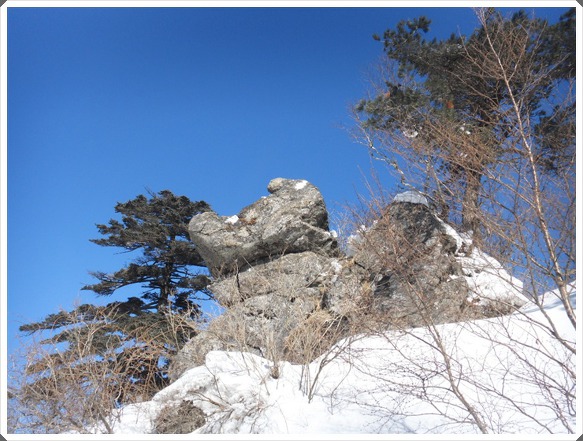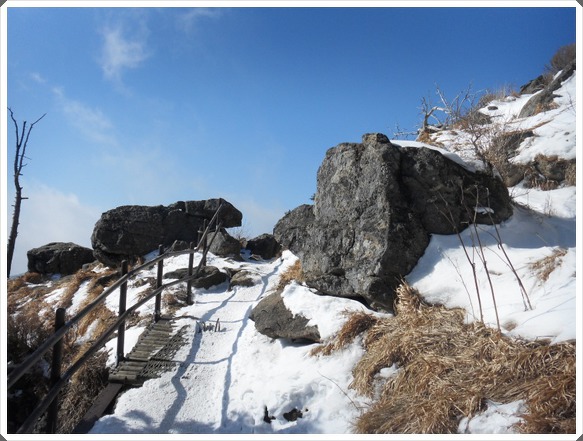 가벼운 걸음걸이가 이어지다가 제법 둔탁한 음이 들려옵니다. 우리의 이 총무님이 얼음에 미끄러지면서 이마로 길바닥 바위의 강도테스트를 하셨나 봅니다. 나 같으면 성질나서 미칠 일인데도 잘 웃어넘기는걸 보니 젊은 사람이 참 성격이 좋은 것 같습니다. 하기사 바위는 태초부터 그 자리에 지키고 있었고 움직이는 총무님 이마가 가서 부딪혔으니 바위가 성질 날 일이지 총무님이 쏘가지 부리면 안 되겠지요. 총무님은 많이 아팠겠지만 덕분에 일행들은 즐거웠습니다. 얼마 지나지 않아 이번에는 회장님이 길바닥에 드러누워 뭘 줍고 있는지 일어나지 않고 있습니다. 내 마음이 꽤 아팠습니다.