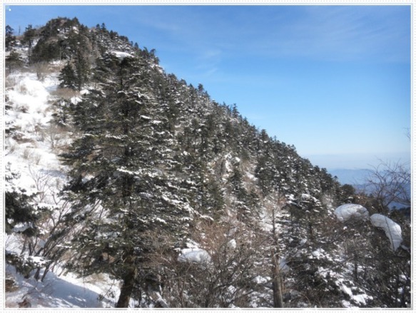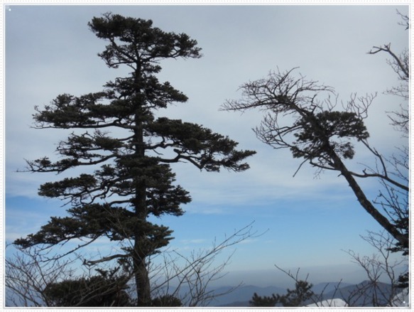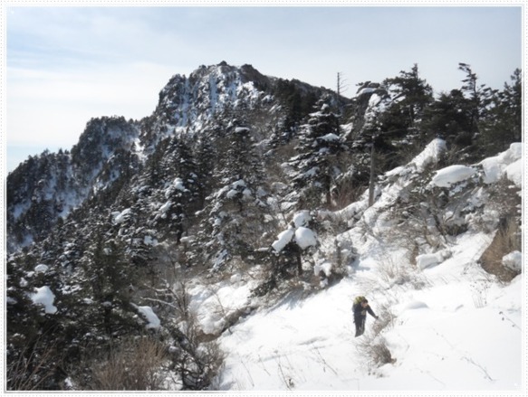 천왕봉에서 중봉으로 내려가는 길은 사람들의 통행이 없어 쌓인 눈으로 아이젠 착용과 관계없이 쭉쭉 미끄러져 흘러 내려갑니다. 자칫 잘못하면 길을 이탈하여 곤두박질칠 수 있어 각고의 조심을 요합니다. 중봉(11:35)에서부터 장황하게 펼쳐진 태극종주길의 동부능선과 남녘땅 최고봉 천황봉의 뒷모습을 볼 수 있는 코스로써 지리산 최상의 경치를 감상할 수 있습니다. 여러 번의 엉덩방아 찧기와 미끄럼타기에 힘입어 써리봉(12:15)에는 순식간에 도착이 됩니다. 써리봉에서 바라보는 천왕봉과 중봉의 뒤태가 너무 아름답습니다. 나중에 날 풀리고 눈 녹은 후 거꾸로 다시 한 번 올라야겠습니다.