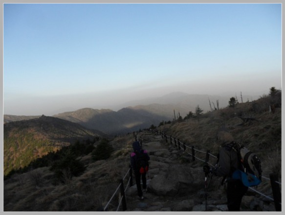 우리 집안이 3대째 크게 잘못한 것이 없었나 봅니다. 천왕봉은 오늘도 역시 동쪽하늘에서의 멋진 일출을 선사해줍니다. 로타리대피소에서 함께 출발했던 두 자매 아주머니와 오상묵씨는 장터목대피소에서는 중산리로 하산하신다고 합니다. 장터목대피소 취사실에서 라면 끓여 간단하게 아침식사를 하고 그 세분들에게는 좋은 산행을 주문하고 세석을 향해 나 홀로 부지런히 걸었습니다.