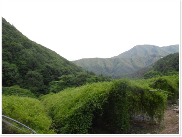 산타나가 좋아하는 단체사진 한 장 남기고 서둘러 수분재를 출발(7:30)하여 신무산으로 향합니다. 그런데 어째 길이 처음부터 수상합니다. 산길로 접어들어야만 정맥길이 시작되는데 자꾸 오미자 밭으로 들어갑니다. 조금 전 논두렁으로 가라는 방향표시를 무시하고 올라간 것이 잘못이었습니다. 오미자 밭에서 무작정 산비탈로 치고 올라가니 선명한 정맥길이 나타납니다.