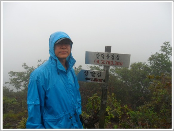만덕산 오르는 가파른 길에서 처음으로 사람이 만든 이정표를 발견합니다. 원불교훈련원과 헬기장과 정상이 있다는 표지판입니다. 이마저도 부실합니다. 장수-익산간 고속도로에서는 달리는 차량들의 소리가 윙윙거립니다. 가파른 암릉을 치고 올라야 하며 제2 터를 지나고 바위길이 이어지고 가끔 산죽을 밟고 지나야 하기에 빗물로 인한 산죽은 미끄럼까지 더해 아주 위험합니다. 여기에서 우리의 만리향이 다리의 고통을 호소합니다. 어제 생전하지 않던 줄넘기를 했다나 어쨌다나 좌우지간에 다리가 많이 안 좋은 모양입니다. 아직 갈 길이 구만리인데 걱정은 약간 되지만 항상 시동이 늦게 걸리는 스타일이라 한번 믿어보기로 합니다. 송신탑이 있는 만덕산 삼거리(12:45)에서 만리향은 휴식을 취하고 산타나와 나 고집통은 만덕산을 갔다 오기로 합니다. 지척에 만덕산(12:56) 정상이 있었고 무슨 연유인지 몰라도 정상을 알리는 표지판은 넘어져있고 관리는 허술하기 짝이 없습니다.