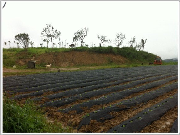 정황으로 보아 지도상의 신전리재(6:15)라고 생각되는 지점은 철망으로 정맥길이 막혔고 아슬아슬하게 철망 밑으로 이동하려니 미끄럽고 위험한 비탈길로는 도저히 갈 수 없어 철망을 뛰어 넘습니다. 철망 안쪽은 이제 막 고랭지배추를 심어 놓은 채소밭이고 주위에 무시무시한 개 네 마리가 제 역할 한답시고 온산이 떠나갈듯이 짖어댑니다. 그런데 저 불쌍한 놈들은 이번 복날은 잘 넘겼다만 밥이나 제대로 얻어먹고 있는지 걱정입니다.