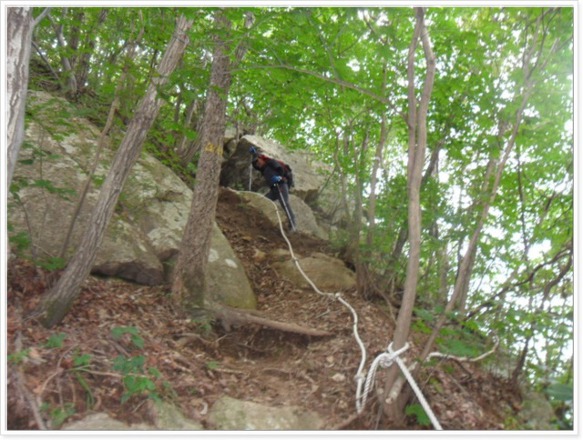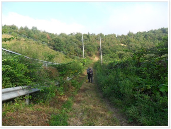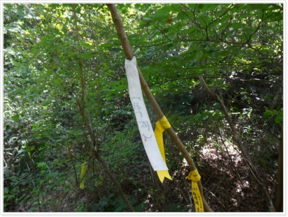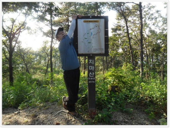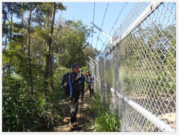 머나먼 임도길이 끝나고 폭발물 처리장이라는 군부대 경고판이 나오고 기나긴 철조망이 나옵니다. 철조망을 따라 오르면 헬기장이 있고 갈미봉(10:00)이라는 작은 간판이 나무에 매달려있습니다. 이젠 철조망을 따라 내려가는 길입니다. 만리향과 고고는 대명(代名)에 걸맞게 앞서 고고씽 입니다. 앞서가던 두 사람에게서 문제가 생겼습니다. 만리향 앞에 가고 있던 고고가 갑자기 시야에서 사라졌다 합니다. 이전까지만 해도 거미줄이 만리향 얼굴에 걸리는 일이 없었는데 두 번이나 걸렸다는 것입니다. 세 사람이 산이 떠나가도록 불러 봐도 전화기를 돌려봐도 고고로부터 메아리가 없습니다. 더 이상 찾기를 포기하고 잠시 쉬고 있으니 지친 모습의 고고가 뒤에서 나타납니다. 정확하진 않지만 남관초등학교 갈림길에서 길을 잘못 들었다 돌아온 것 같습니다. 이후로 고고가 절대로 앞서가는 경우는 보지 못했습니다.