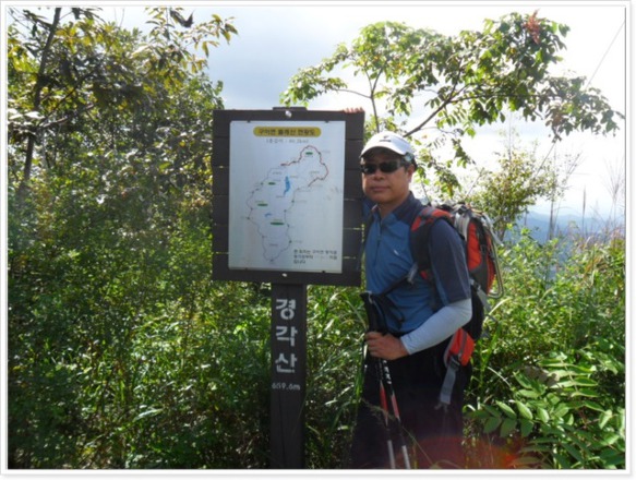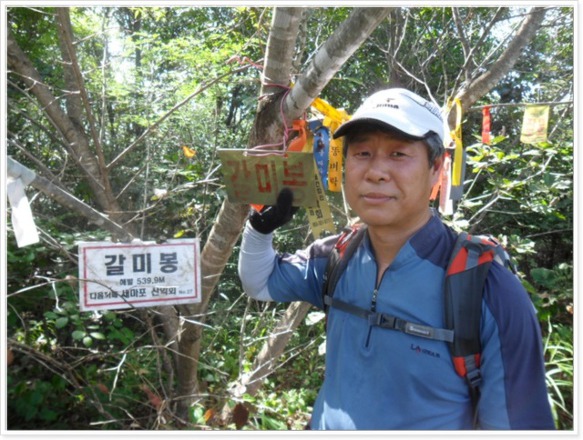 머나먼 임도길이 끝나고 폭발물 처리장이라는 군부대 경고판이 나오고 기나긴 철조망이 나옵니다. 철조망을 따라 오르면 헬기장이 있고 갈미봉(10:00)이라는 작은 간판이 나무에 매달려있습니다. 이젠 철조망을 따라 내려가는 길입니다. 만리향과 고고는 대명(代名)에 걸맞게 앞서 고고씽 입니다. 앞서가던 두 사람에게서 문제가 생겼습니다. 만리향 앞에 가고 있던 고고가 갑자기 시야에서 사라졌다 합니다. 이전까지만 해도 거미줄이 만리향 얼굴에 걸리는 일이 없었는데 두 번이나 걸렸다는 것입니다. 세 사람이 산이 떠나가도록 불러 봐도 전화기를 돌려봐도 고고로부터 메아리가 없습니다. 더 이상 찾기를 포기하고 잠시 쉬고 있으니 지친 모습의 고고가 뒤에서 나타납니다. 정확하진 않지만 남관초등학교 갈림길에서 길을 잘못 들었다 돌아온 것 같습니다. 이후로 고고가 절대로 앞서가는 경우는 보지 못했습니다.