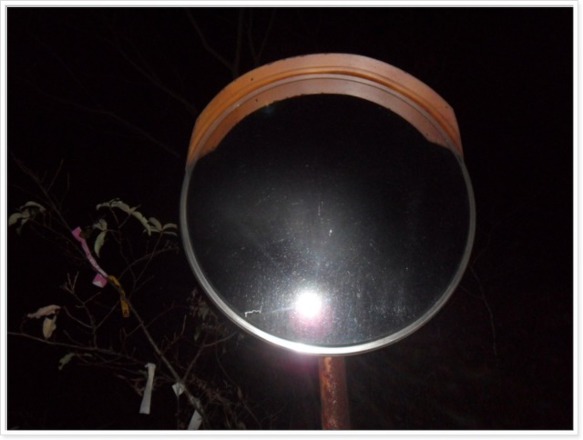정맥길 가장자리에 철조망이 쳐져있어 개구멍을 통과합니다. 대인지뢰『크레모아 설치 되어있음』이라는 팻말이 후래쉬 불빛에 비쳐 섬뜩하지만 민간인이 출입하는 호남정맥에 설마하니 이런 무시무시한 것을 심어 놓았겠나 싶어 그냥 지나칩니다. 망대산(2:50) 꼭대기 시멘트광장에 올라서게 되고 희미한 실루엣의 거대한 통신탑이 우릴 내려다보고 있습니다. 통신탑엔 지기가 살고 있는지 안에서 목청껏 짖어대는 개소리에 주눅이 들어 겁먹고 근처 접근할 엄두를 못 내어보고 그냥 시멘트 길을 따라 내려갑니다.