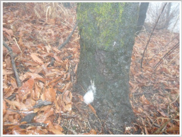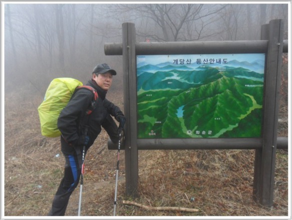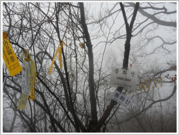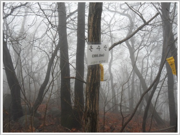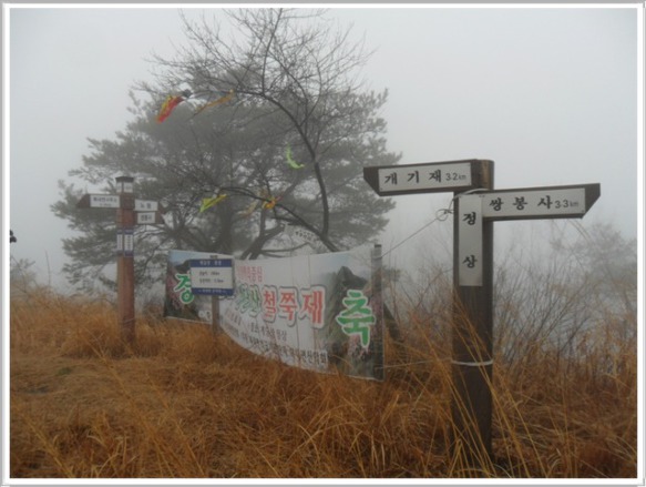 개기재 차로에 산토끼 세 가족이 놀러 나왔다가 차량 불빛을 받아 어찌할 바를 모르고 도로 한가운데에 그냥 멈춰서 버립니다. 겁에 질려 뒤돌아보는 산토끼의 모습이 앙증스러운데 저러다 로드 킬이라도 당하면 어쩌나 심히 걱정입니다. 안개비로 인해 앞뒤 구분이 되지 않아 개기재(6:00)의 산행 들머리를 한참 동안 찾아 헤매다 가까스로 찾아냈습니다. 직접 때리는 빗방울은 아니지만 안개비가 옷에 묻어 물방울이 송골송골 맺힙니다. 이러나저러나 옷 젖는 것은 매 마찬가집니다. 제법 긴 시간을 올랐다 생각할 즈음 부근에 나무 벤치가 준비된 헬기장(7:00)이 나옵니다. 아마도 이곳에서 매년 5월이면 철쭉축제를 하는 곳인가 봅니다. 머지않은 곳에 계당산(7:20) 정상이 나왔으며 2011년 봄날에 걸어 두었던 철쭉제 플랜카드가 아직도 그대로 있습니다. 참말로 남사스런 일입니다.