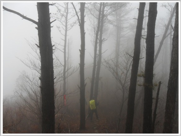 안개로 인해 한치 앞도 구분이 되지 않는데 산 아래에서는 자동차 달리는 소리가 윙윙거립니다. 아마도 새로 뚫렸다는 예재 터널 바로 위에 내가 있는 것 같습니다. 헬기장을 지나고 나니 이젠 그 역할을 다하고 난 26번국도 예재고개(9:33)가 나타납니다. 가끔 우리 같은 정맥꾼이나 이곳을 지나갈까 길 아래 터널이 생긴 이후로는 아무도 지나지 않을 것으로 생각됩니다. 날씨가 궂은 관계로 조망하고 쉴만한 끈덕지기가 없어 앞만 보고 달렸기에 벌써 오늘 가야 할 길의 절반을 지나왔습니다.