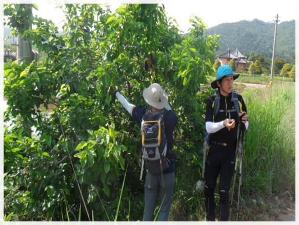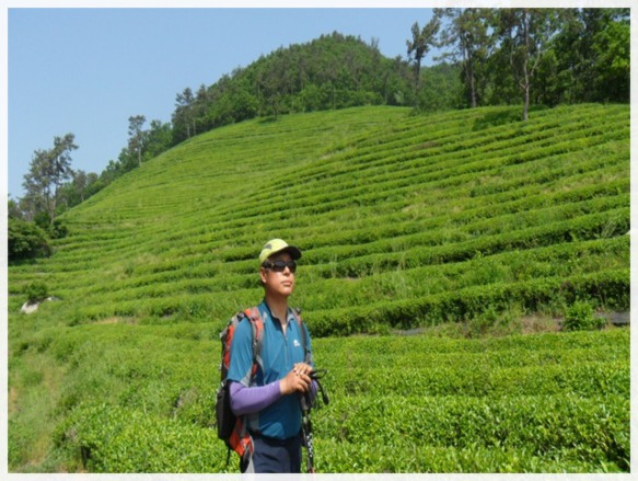 한치재를 따라 약 100m 가니 삼수마을이라는 표지석(8:35)이 있습니다. 아미봉을 찾아 제대로 내려 왔다면 이곳으로 바로 접속했을 겁니다. 들판을 가로 지르는 농로를 한참 동안 걸어갑니다. 농로 변 뽕나무에는 까만 오디가 지나가는 산객을 유혹합니다. 삼수마을 정자에서 약간의 휴식을 취하고 삼수재까지 따가운 햇살을 받으며 시멘트 길을 오릅니다. 삼수재에서부터 임도길을 쭈욱 타고 가야하고 활성산까지 삥 돌아서 가고 있는 느낌입니다. 활성산(9:40) 정상을 막 넘어서고서는 온 산이 녹차 밭입니다. 이제 본격적으로 보성 땅으로 접어들고 있습니다. 봇재다원에서 철조망을 쳤나 본데 그냥 밟고 넘습니다. 봇재가든(10:20) 뒤 텃밭으로 길은 연결되고 무시무시하게 큰 개 두 마리가 왕왕거리다 우리가 근처에 접근하니 순한 양이 되었다가 우리가 멀어지니 또 왕왕거립니다. 겁이 참 많은 놈들입니다.