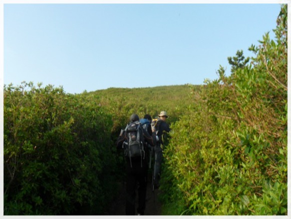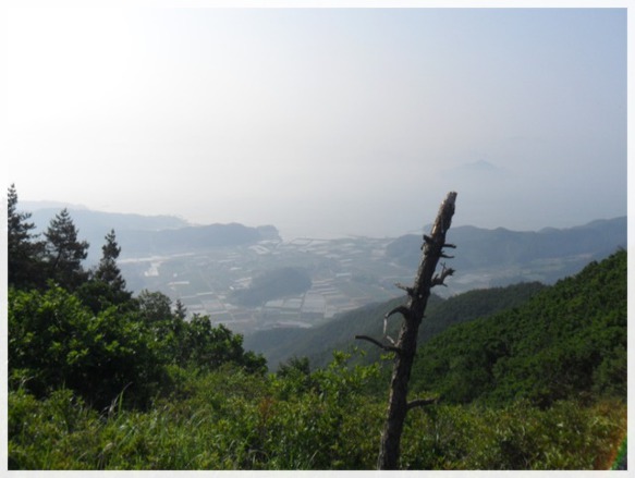 산죽터널을 지나고 꽃 없는 철쭉나무 터널을 지납니다. 철쭉꽃이라면 전국 제일을 자랑하는 일림산(6:35) 정상에 오릅니다. 지난번 제암산을 지날 때 건너편 능선에 붉게 불타고 있던 일림산이 이젠 철이 지나 그 화려했던 모습들은 사라지고 녹음 짙은 밋밋한 산으로 변해있습니다. 세상 이치처럼 꽃 떨어지고 화려함이 가시고 나니 벌, 나비가 찾아주지 않듯이 불과 몇 주 전만 해도 그렇게 붐비든 사람들이 이곳 일림산을 아무도 찾는 이 없어 우리가 일림산 주인이 되었습니다. 가끔 뒤늦게 봉우리를 틘 철쭉이 관심을 끌라 하지만 게으른 꽃들에게는 일행들 중 누구 한 사람 시선을 주지 않습니다. 일림산 정상에서는 탁 트인 보성벌판과 멀리 득량만의 바다가 조망됩니다. 소나무 한 그루가 절묘하게 강렬한 아침햇살을 막아주는 나무데크에 자리 잡고 간단하게 김밥으로 아침식사를 해결했습니다.
