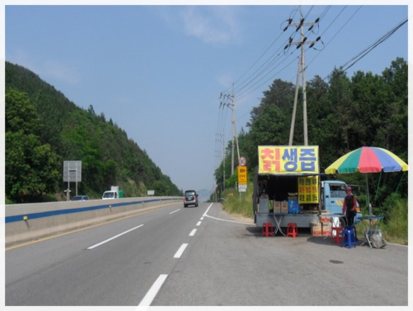 바람재(14:38)를 지나고 칡넝쿨 우거진 밀림지대와 잘 정돈된 편백나무 숲도 지나고 2번국도 그럭재(15:00)에 내려섰습니다. 그럭재 트럭주막의 냉 칡즙이 갈증을 확 풀어줍니다.