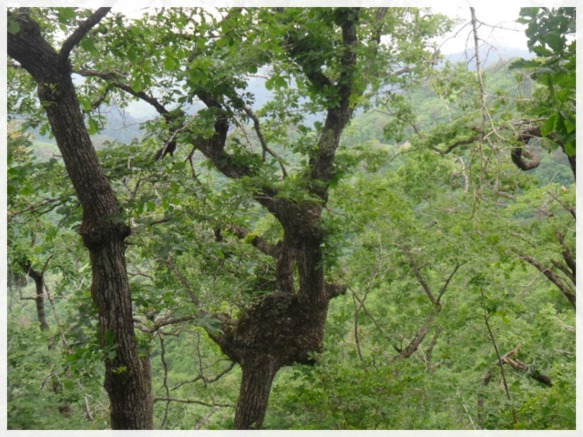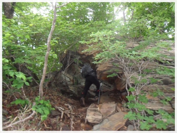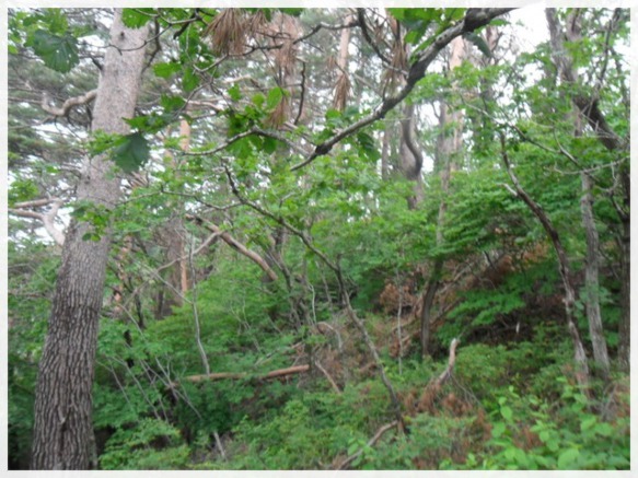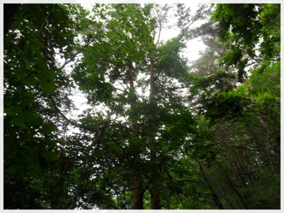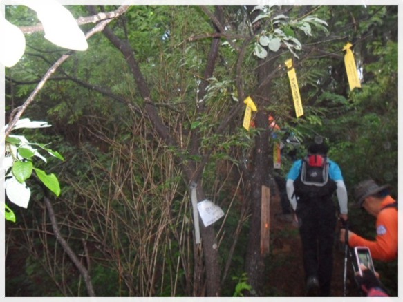 문지골 6폭포 표지판이 있는 문지골삼거리(13:25)를 지나고 나니 약 1Km의 거리를 치고 올라야 하는 용인등봉의 마지막 한 고비만이 남았습니다. 고지대의 산죽들이기에 내 키보다 훨씬 자라 얼굴을 쓰윽 할퀴고 나뭇가지들은 열 번도 더 모자를 벗깁니다. 얼굴을 신경 쓰면 나뭇등걸이 사정없이 촛대 뼈를 가격합니다. 오늘 위아래 신경 써느라 정신없습니다. 산죽 밭을 벗어나니 이번에는 작년 태풍에 부러진 금강송과 참나무 가지가 등산로를 완전히 차지해버려 진행에 아주 어려움을 겪습니다.