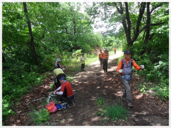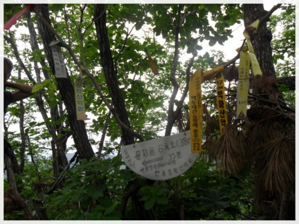 맞은편에서 정맥꾼 한 분이 내려옵니다. 일행들은 임도를 탔고 본인은 등로를 타고 내려왔는데 일행 들이 먼저 지나가지 않았나 물어옵니다. 얼마 지나지 않아 그 분 일행들이 우르르 몰려 내려옵니다. 아주머니들은 서울에서 왔다 하고 아저씨들은 부산갈매기들이라고도 하는데 성분은 종잡을 수 없는 일행들입니다만 모습은 즐거워 보입니다. 발목을 삐어 절뚝거리는 아저씨가 있어 내심 걱정입니다. 산허리를 타고 도는 임도보다는 산 능선을 타는 등로가 더 가깝다는 것을 알았습니다.