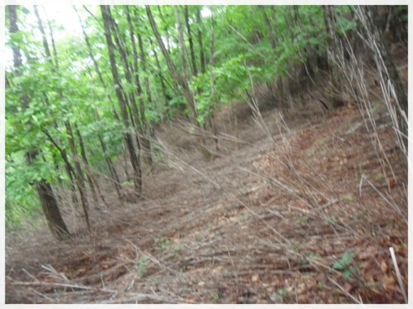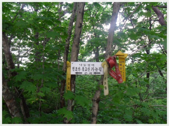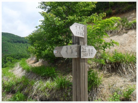 신작로보다 넓은 임도(9:05)가 나옵니다. 아주 가파른 산길을 치고 오르니 전곡, 소광, 석포 갈림길의 이정목이 있는 임도(11:05)가 나오고 새로운 능선을 치고 나니 또 임도가 나옵니다. 바로 앞에 삿갓봉이 있으나 임도(12:25)를 통하는 것이 아무래도 편할 것 같아 삿갓봉은 포기하기로 합니다.