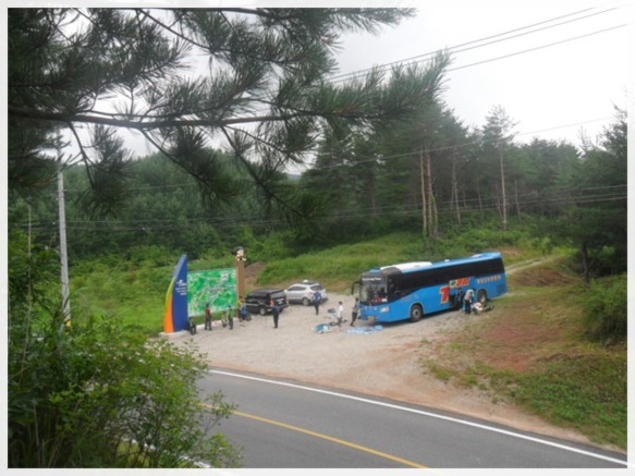 답운재에는 버스 한대가 또 다른 정맥꾼을 무료하게 기다리고 있습니다. 우린 낙동정맥 3구간 산행 들머리인 답운재(11:47)에서 가볍게 몸을 풀고 통고산으로 향합니다. 이곳에도 어김없이 준, 희님의 정맥 하시는 분들에게 힘내시라는 문구가 나무에 걸려있습니다. 참말로 고마우신 분입니다.