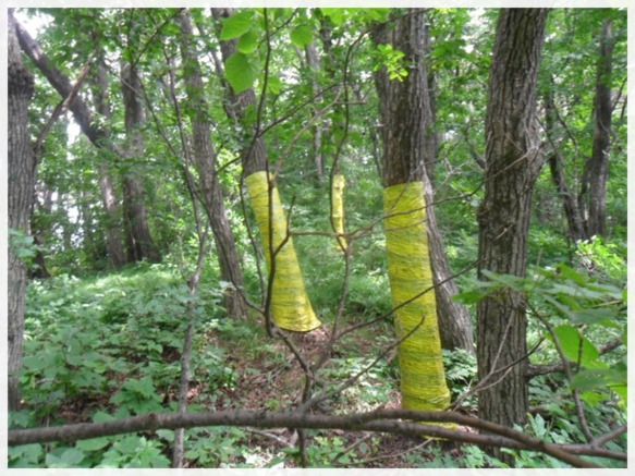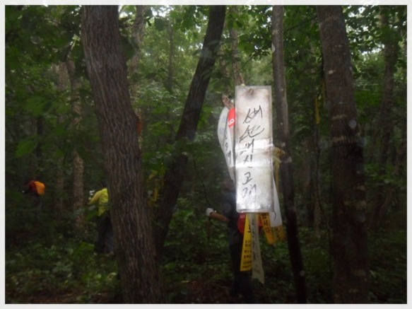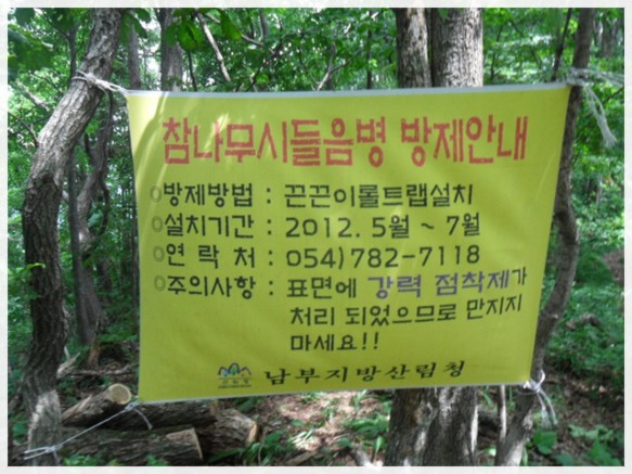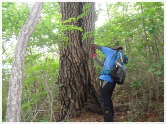 처음으로 나타나는 폐 헬기장(12:31)에서 막걸리 한잔으로 갈증을 해소하고 가파른 비탈길을 치고 오르니 멋들어진 금강송이 자태를 뽐내고 있는 임도(13:20)를 만납니다. 참나무 시들음병 방제안내 문구와 함께 끈끈이 롤 테이프를 참나무 몸통에 돌돌 말아놓은 모습이 눈에 띕니다. 남부지방에는 소나무가 잎마름병으로 수난을 당하는데 이곳에는 참나무 시들음 병이 있나 봅니다. 그곳에는 별의별 나방들이 끈끈이 롤에 달라붙어 사망해 있습니다.