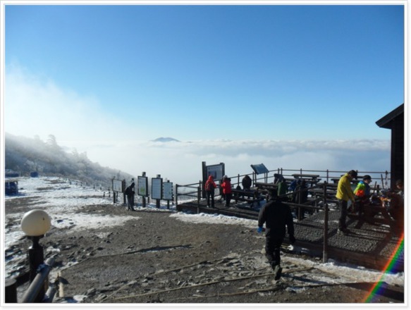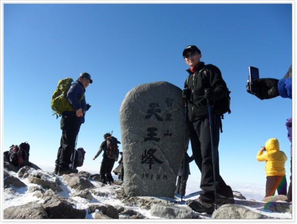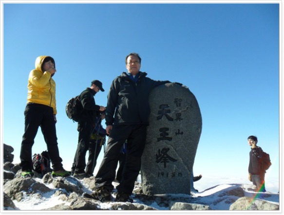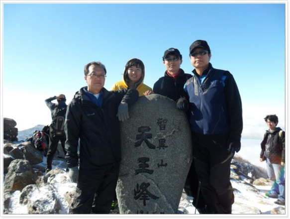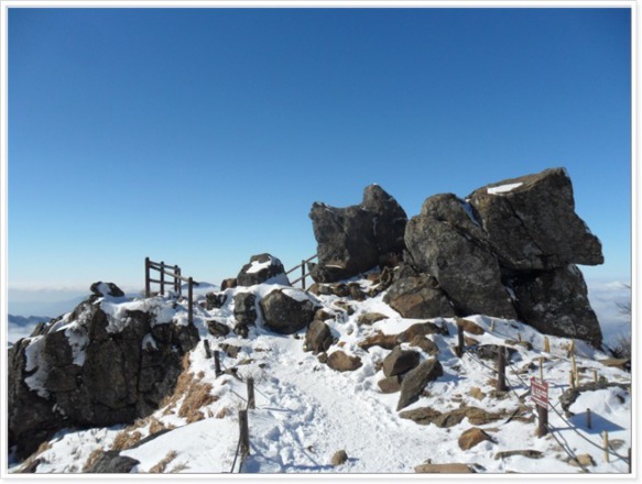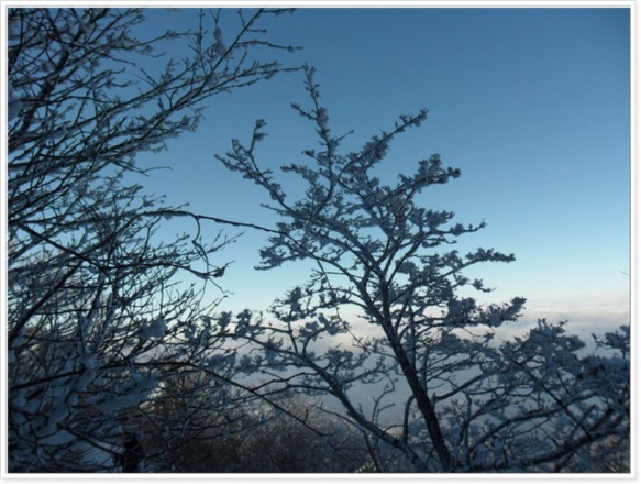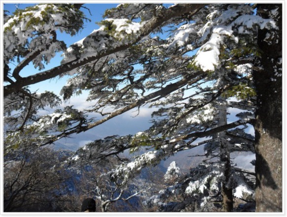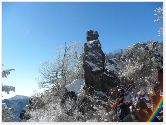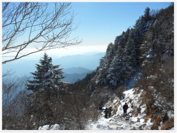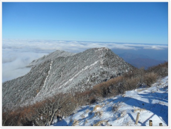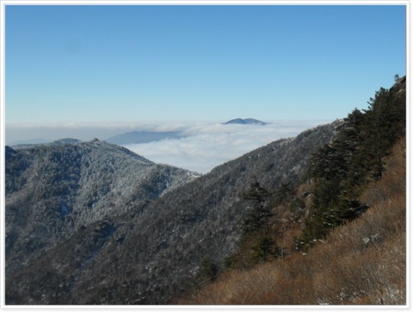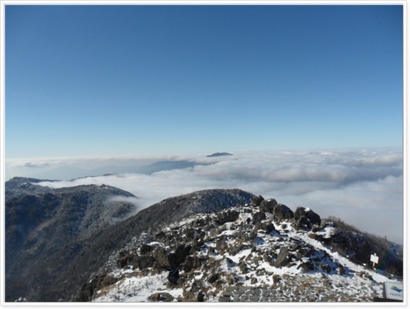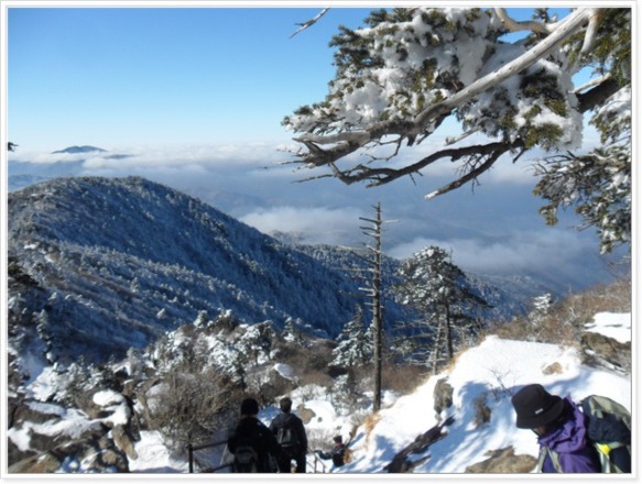 지리산에 처음 오르는 두 분은 처음이라고 생각 들지 않도록 상상외로 잘도 오릅니다. 천왕봉에 올라서고 우린 숨이 멎을 뻔 했습니다. 이 세상에서 꿈에도 생각지 못했던 새로운 세상이 발아래 펼쳐져 있습니다. 칠선계곡과 백무동이 있는 함양 땅은 포슬포슬 솜이불을 뒤집어 쓴 채 잠들어 있습니다. 출장길 비행기에서 내려 보면 살짝 뛰어내리고 싶어지는 하얗디하얀 그런 구름이 온 세상을 뒤덮고 있습니다. 환상입니다.