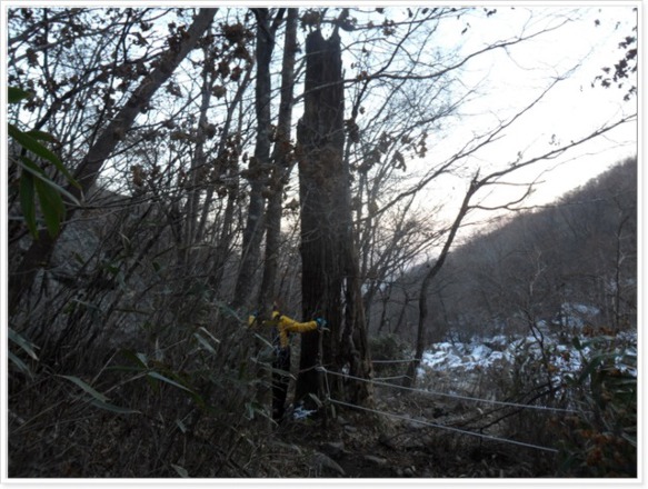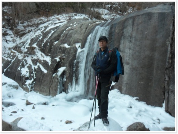 중산리계곡이 눈으로 얼어붙어 아이젠이 없이는 불가능합니다. 유암폭포는 아직 물이 흐르고 있어 지난 1월의 아름다웠던 모습은 아직 나오지 않습니다. 지난여름 폭우로 인해 등로길이 많이 훼손되어 약간 위험하기도 합니다. 칼바위삼거리에 도착하니 날이 어둑어둑해졌습니다.