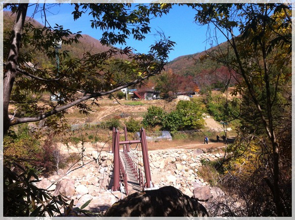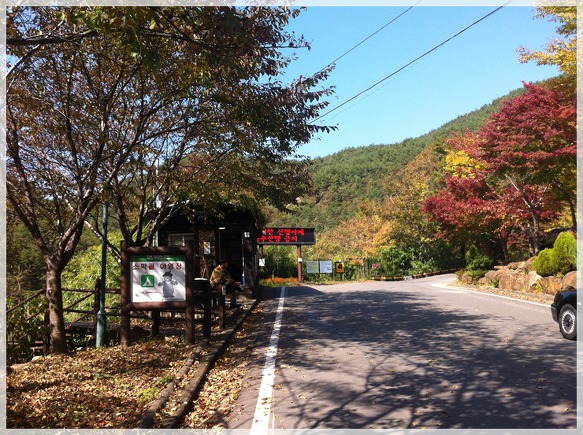 단풍놀이 나오신 분들이 계곡에 앉아 「참이슬」에 빠져 있습니다. 『안녕하세요?』 인사 한마디에 한 잔하고 가라십니다. 스트레이트 깡 소주 세 잔에 다리가 풀렸습니다. 첫 화대종주 때 발톱 2개가 빠져버렸던 고통스런 그 콘크리트 내리막길이 너무 싫어 새재마을로는 다시는 내려오지 않겠다고 다짐 했건만 또 내가 그 길을 밟고 있습니다. 어쩔 수 없는 고집통입니다.