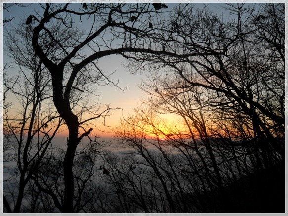 어제 주산재에서 설티재 내려오는 길이 장난 아니게 멀었기에 다시 주산재까지 치고 오른다는 것이 부담스러워 둘째 날은 융통성을 발휘하여 황장재에서 남진을 하기로 했습니다. 지난번 황장재로 하산할 때는 보이지 않던 풍차가 날개에 불빛을 환히 밝힌 채 돌고 있습니다. 황장재(5:17) 또한 주왕산 국립공원으로써 비 탐방구간이므로 출입을 통제한다는 경고 판이 설치되어 있습니다. 제법 넓은 임도길을 따라 새벽 어둠을 뚫고 낙동정맥 일곱 번째 둘째 날 산행을 시작합니다. 비탈길을 오르다 평 길을 가다 또 올라가는 길이 연속으로 이어집니다. 가끔 뒤가 마려워 몸이 무거운 것을 제외하고는 별일 없이 잘 걸었습니다. 대둔산 조금 못 미쳐서 급경사 길을 오르다 오른쪽 다리 착취 점이 균형을 잃으면서 발끝이 뒤로 미끄러집니다. 『악』. 하는 순간 지난 호남정맥 졸업 때 경험한 것과 동일한 장딴지 고통이 밀려옵니다. 찌릿한 아주 기분 나쁜 경련이면서 그 고통이 너무 심해 제대로 걸음걸이가 되질 않습니다. 딱히 그래야만 될 이유가 없는데 왜 이런 현상이 나타나는지 모르겠습니다. 산행 중 벌써 두 번째 같은 부위에 동일한 문제가 발생하니 심도 있게 지켜보아야 할 것 같습니다. 고통은 밀려 오지만 감수해야 함은 당연한 일이고 지금 상황에서 아프지만 어쩔 수가 없기에 스프레이 파스로 응급조치를 취하고 장딴지에 테이프를 칭칭 감고 그냥 절뚝거리며 따라갑니다. 아직 동이 트기 전이라 어둠이 남아 작은 돌멩이나 나뭇가지를 밟는 일이 허다하고 그때마다 통증은 더 심해집니다. 대둔산 갈림길(7:40)에 올라서니 동쪽 하늘에 태양이 솟아오릅니다. 여태까지 어둠 속에 묻혀 보이지 않던 아름다운 운해가 발 밑에 쫙 깔린 경치가 사람의 넋을 쏙 빼 놓습니다. 그 순간만은 그렇게도 아프던 다리의 통증도 잊게 만듭니다.
