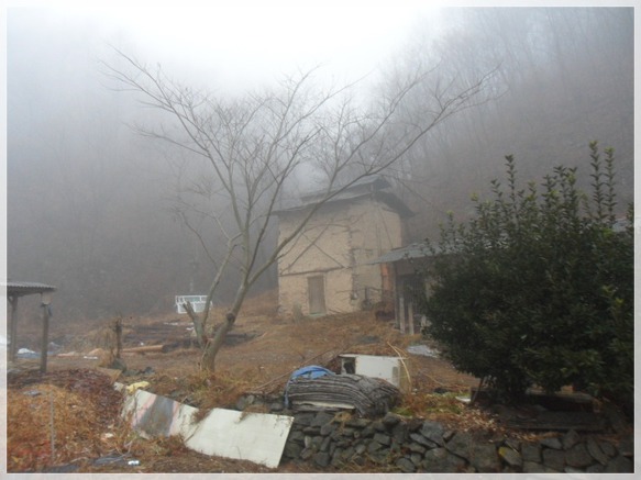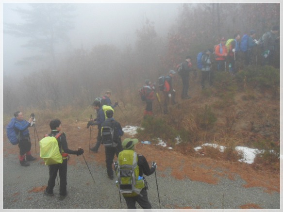 청송 가는 길 버스 속에서 산행 대장님이 자칫 실수가 있어도 잘 봐달라는 애교 섞인 멘트와 함께 달콤한 담금주 한 잔씩을 돌립니다. 낙동정맥 일곱 번째 첫째 날의 출발지점 질고개에는 비가 올 것이라는 예보가 있었으나 안개 자욱하고 날씨는 잔뜩 찌푸리고 있습니다. 어제 저녁 내린 따뜻한 비로 정맥 길의 눈이 녹아 눈에 대한 걱정은 사라졌습니다만 혹시 빗물이 바짓가랑이를 타고 내려 신발 속으로 물이 스며들까 염려스러워 스패츠를 단단히 묶었습니다.