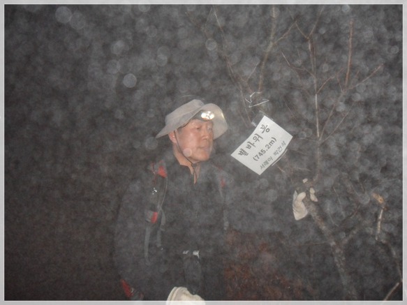 부동봉(16:49)을 지나고 나서는 날이 어두워졌습니다. 하루 종일 안개가 걷히지 않더니 급속도로 어둠은 찾아오고 통천문 부근에서는 헤드랜턴을 켜지 않고는 앞이 보이지 않을 정도가 되어 버렸습니다. 거의 70도의 경사를 육박하는 미끄러운 바위 길을 타고 올라서니 별바위봉(17:35) 정상임을 알리는 표지가 있습니다. 이제는 한치 앞도 보이지 않는 내리막길이 시작됩니다. 아차 하는 순간이면 어찌될지 아무도 모릅니다. 살금살금 아무리 조심해도 두 발은 미끄러져 흘러 내리고 결국에 엉덩방아를 한 번 찢긴 했지만 그나마 안전지대여서 천만다행이었습니다. 오늘의 목적지인 주산재를 지나쳤으나 사실 주산재(18:05)인지도 모르고 앞 사람만 불 빛만 쫓아 내려왔습니다. 그냥 걷다 보니 차량 불빛이 나오고 설티재(18:30)에 내려섰습니다.