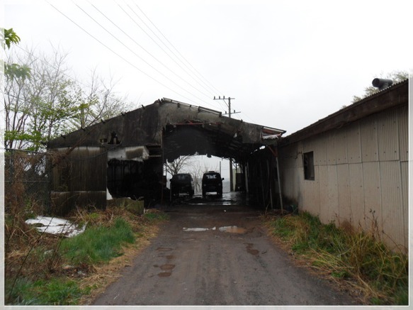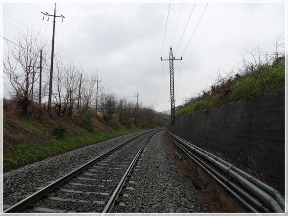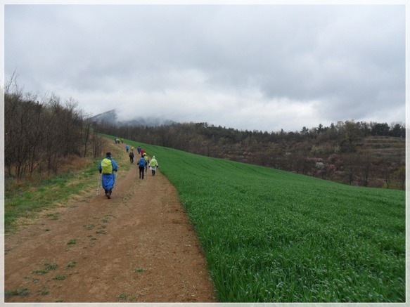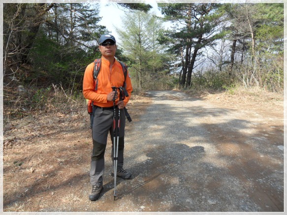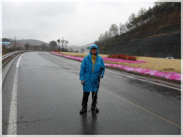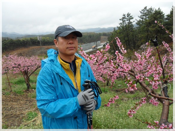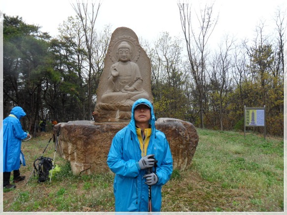 금방 멎겠지 생각한 비는 그칠 줄을 모릅니다. 관산(10:20)을 지나고 비에 젖어 질척질척한 임도길을 따라가다 양계장(11:16) 지붕 밑으로도 통과하게 됩니다. 길 옆 과수원에는 연분홍 빛 복사꽃이 만개하여 정맥꾼들의 발걸음을 즐겁게 해줍니다. 부처님 진신사리탑과 부처님 불상을 모셔놓은 만불산(11:30) 정상에서 점심식사를 하기로 하고 자리를 깔았으나 빗물은 인정사정 없이 밥상위로 뚝뚝 떨어집니다. 번거로움을 피하기 위해 매번 준비하던 불 피우기 음식을 준비하지 않고 산타나가 새벽 일찍 시장에 들러 장만한 약밥으로 끼니를 때우기로 했습니다. 일행들은 삼삼오오 모여 따뜻한 국물로 몸을 데우고 있으나 나 고집통을 포함하여 몇 안 되는 사람들은 계속해서 비를 맞고 있을 수 없고 비에 젖은 몸이 너무 추워 먼저 자리를 뜨기로 했습니다. 아화고개(12:15)의 4번 국도 굴다리에서 약간 비를 피하고 중앙선 철로를 건너 아화마을(12:30) 농기구 창고 건물 처마 아래서 일행들을 기다리기로 했습니다.