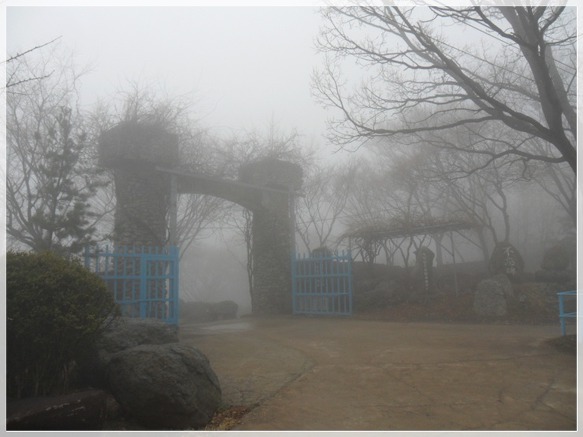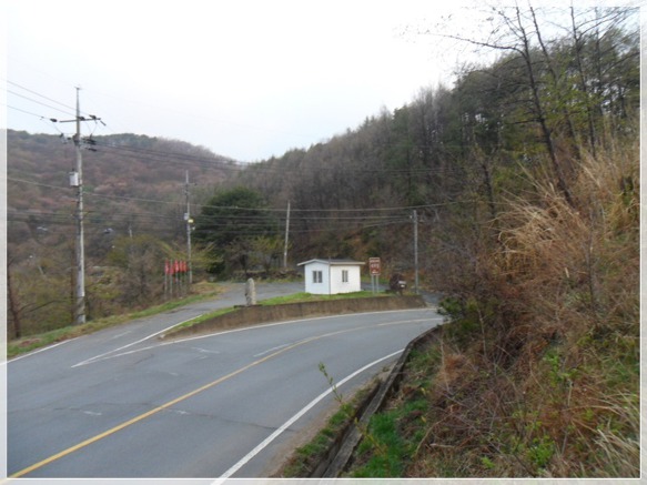 사룡산 올라가는 길은 고도가 살살 높아지면서 기온이 점점 차가워지고 길바닥에 눈가루가 흩뿌려져 있습니다. 길가에 진달래와 노란 야생화가 만발하였건만 4월의 눈이라니 세상이 많이 변해가고 있습니다. 사룡산은 낙동길에서 약간 벗어나 사룡산 삼거리(15:52)에서 아라 생식마을로 방향을 틀었습니다. 안개 자욱한 산능성이에서 이상한 콘크리트 조형물과 거무티티 한 건물이 침침하게 나타나고 자물쇠로 굳게 닫힌 철문을 여럿 지나면서 산 중 곳곳에 설치된 스피커에서 울려 퍼지는 야릇한 방송 음에 주눅이 들어 빠른 발걸음으로 생식마을(16:04)을 벗어났습니다. 만약 고집통 혼자 낙동길을 진행했다면 과연 이곳을 지날 수 있을까 의문이 듭니다. 생식마을 진입로 시멘트 길을 따라 내려가니 오늘의 목적지이면서 야영지인 숲재(16:20)에 도착하게 됩니다.