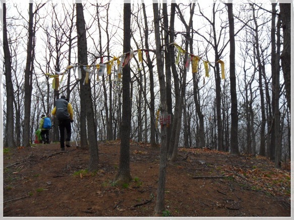 마치재(7:18) 옆 잔디밭에 내려서니 우리의 염원과는 아랑곳없이 빗방울이 토닥토닥 떨어집니다. 예보상 5mm 안팎 일 꺼라 했고 비 제까짓 것이 와 본들 봄빈데 금방 그치겠지 생각하며 낙동정맥 열 번째 첫째 날을 시작합니다. 남사봉(8:00)을 지나고 얼마 가지 않아 산꼭대기에 차량바퀴자국이 선명한 넓은 잔디마당이 있어 도대체 무엇을 하는 곳인지 궁금합니다. 임도를 따라 약간 더 진행하니 『경주시발점』이라는 이정목이 나타납니다. 이곳이 경주시의 시작점인지 아니면 자전거나 차량이 경주하는 출발점인지 구분이 잘 가지 않습니다. 아마도 조금 전 그 잔디밭이 산악자전거 집합 장소이고 경주시발점은 자전거 경주 출발지점을 나타낸 것 같습니다.