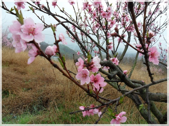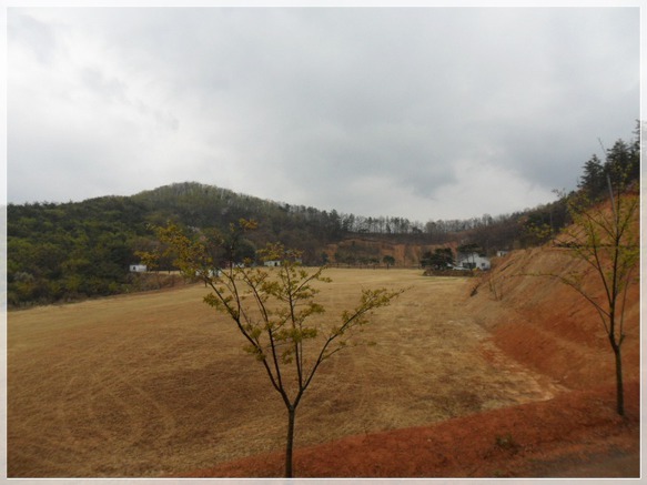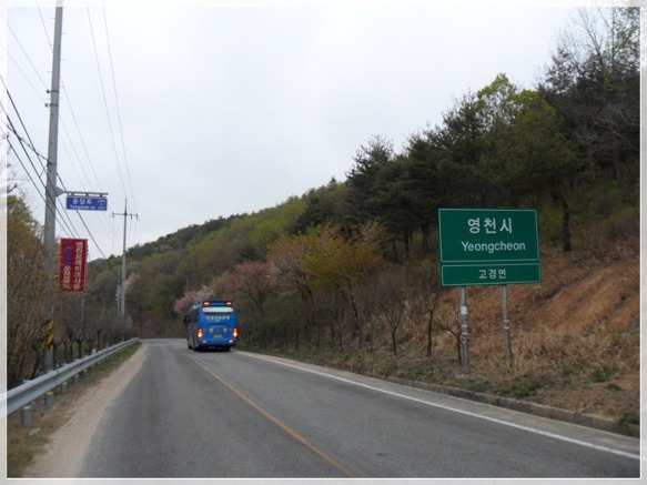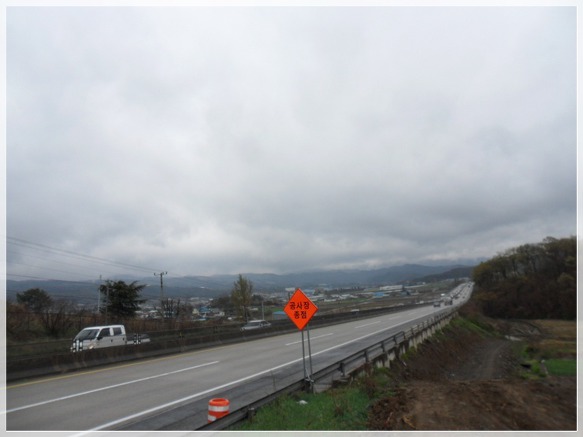 아화고개 일대가 완전 복숭아 과수원들로써 천지가 복사꽃 세상이라 그 아름다움에 넋을 놓습니다. 이번에는 경부고속도(13:36)로 굴다리를 통과하고 잠시 후에는 909번 지방도도 건넙니다. 오늘 고속도로, 국도, 지방도, 철로, 임도, 고갯길 등 길이라는 길은 죄다 지나갑니다. 얼마 후 끝없이 펼쳐진 목초지대(13:50)를 만납니다. 비 오는 날의 수채화를 생으로 보는듯합니다. 절대 사진으로는 표현이 되지 않는 그런 멋진 풍경입니다.