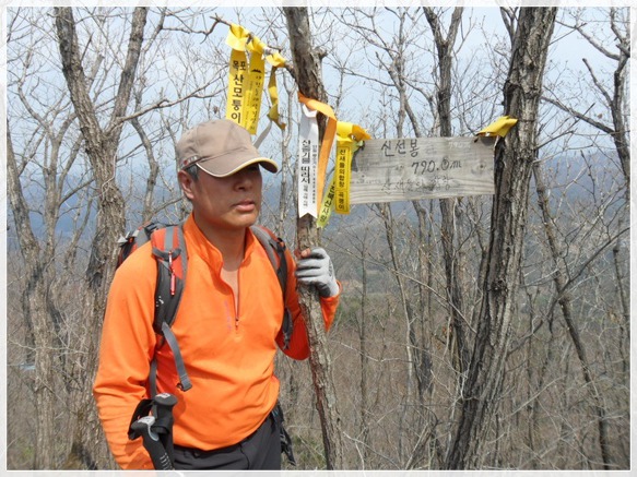 멋진 소나무 한 그루와 돌탑 두 기가 있는 독수리봉(12:00)이 나옵니다. 정상의 바위가 멀리서 바라보면 흡사 독수리 머리 모습을 하고 있다 하여 독수리봉이며 여기서부터 육백고지라 일컫는 백암산(12:58)까지 암릉 능선이 이어지고 후로는 진달래꽃 터널을 통과하게 됩니다. 아니 진달래꽃 밭이라 해야겠습니다. 내가 사는 거제에는 한 달도 더 전에 진달래축제를 끝내고 이미 온 산이 녹음으로 우거졌거늘 이곳 금산 땅에는 이제서야 아름다운 연분홍 꽃을 피워 정맥하는 산님들의 바쁜 걸음을 붙잡습니다. 이후로도 금남길은 한참을 올랐다 내렸다 고도가 춤을 춥니다. 게목재(14:24)에서 신선봉(14:32)을 오를 때 갑자기 헛구역질이 올라옵니다. 지난밤 감기몸살로 인해 잠을 제대로 못 잔 이유도 있겠고 봄 날씨 치고는 너무 무더워 탈진 증세를 보이는 것 같습니다.