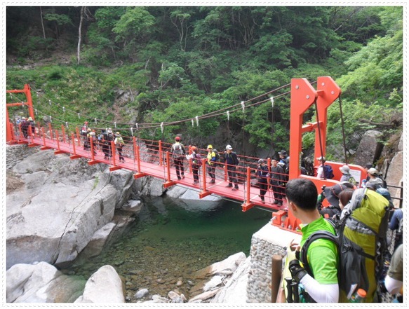 예약자의 신분증과 여행자보험 등을 확인한 51명의 탐방객이 3명의 공단직원 안내를 받으며 추성리 주차장을 출발합니다. 두지마을과 옛 칠선마을의 독가촌을 지나면서부터 울창한 잡목 숲을 따라가니 칠선교 출렁다리가 나오고 이곳부터 험한 산길이 선녀탕까지 계속됩니다. 하늘에서 내려와 목욕을 즐기던 일곱 선녀의 옷을 훔친 곰이 옷을 바위틈 나뭇가지에 숨겨놓는다는 것을 사향노루의 뿔에 걸쳐놓아 버렸습니다. 선녀들이 옷을 찾아 헤매는 것을 본 사향노루는 자기 뿔에 걸려있던 옷을 선녀에게 가져다 주어 무사히 하늘나라로 되돌아갈 수 있게 되었고 그 후 은혜를 베푼 사향노루는 칠선계곡에서 살게 해주고 곰은 이웃 국골로 내 쫓아 버렸다고 하는 선녀탕에 얽힌 전설이 있습니다. 바로 위엔 옥녀탕도 있습니다.