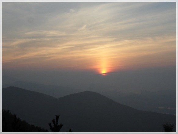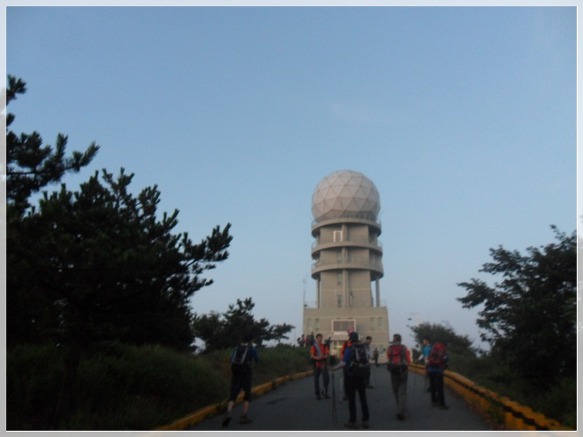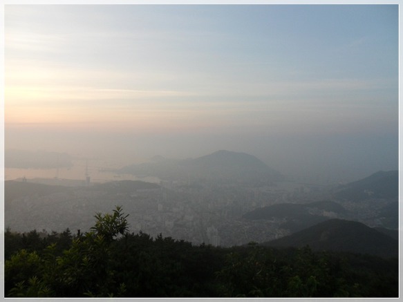 시락국밥에 커피로 배 속을 충전시키고 구덕문화공원 홍살문을 통과하여 구덕산을 향해 올라갑니다. 구덕산(5:19)의 정상에는 부산 항공무선소가 자리를 잡고 있으며 무작스런 개 한 마리가 제 밥값 하겠다고 새벽 산이 떠나가도록 마구 짖어 댑니다. 시약산(5:38) 레이더 기상관측소 바로 아래에서 낙동정맥 마지막 일출을 감상합니다. 멀리 남항, 북항대교가 희미하게 보이고 그 위에 붉디 붉은 태양이 솟아 오릅니다. 한참을 일출삼매경에 빠졌다가 일행의 뒤를 따르다 보니 선두를 놓쳐 대치고개 내려설 때는 마을 골목길을 통과하는 등 약간의 혼선을 빚었습니다.