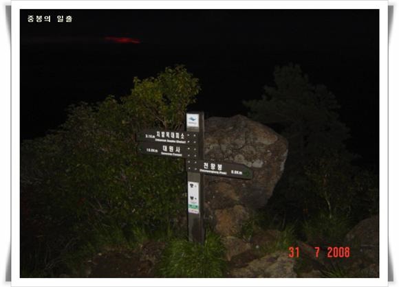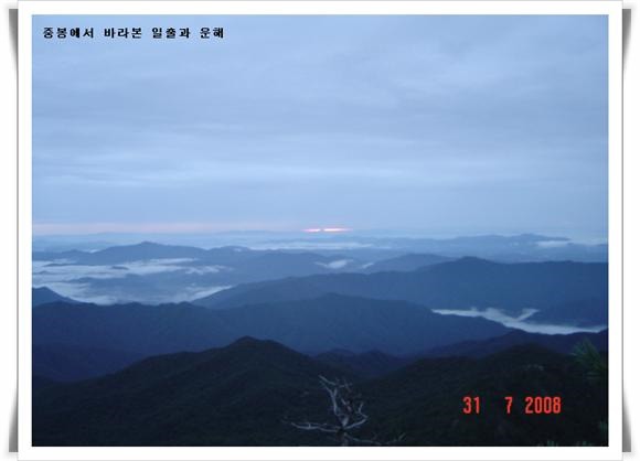 중봉(5:15)에 올라서니 이제 아침 여명이 밝아오고 동쪽 저편하늘이 서서히 붉어지기 시작합니다. 천왕봉에 비해 중봉의 일출 광경이 더 멋있다는 소리를 익히 들은 적이 있어 중봉에서 일출을 맞을 준비하였으나 살짝 붉어지던 동녘하늘은 다시 구름 속으로 자취를 감춰버리고 이것으로써 오늘의 일출은 끝이나 버렸습니다.