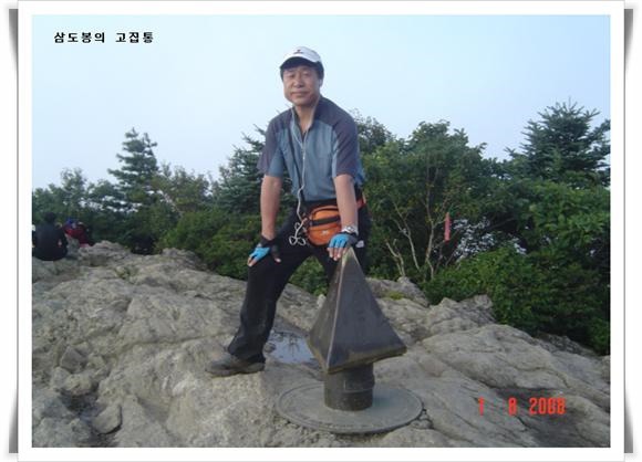 삼도봉에는 12시 대구에서 출발하신 네 분의 아저씨들이 여태까지 반대로 오는 사람은 처음 본 다며 반갑게 맞이하며 김밥 한 줄을 권합니다. 어차피 아침 식사를 하지 않은 관계로 얼른 감사의 뜻을 전하고 바짝 다가 앉았습니다. 아직 단체사진을 한번도 못 찍어셨다기에 삼도봉 삼각뿔을 배경으로 한 컷 눌러주고 안전한 산행하시라는 인사말을 남긴 후 노루목을 향했습니다.