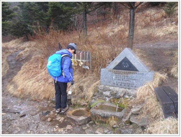 세동치 바로 위 헬기장에서 자리를 잡고 라면을 끓이기로 했습니다. 인근에 샘터가 있으니까 라면 물을 받아야 하기 때문입니다. 약 3년 전에 그 샘터 옆에서 하룻밤을 묵은 적이 있고 혹시나 또 다음을 생각하여 그 샘터에 꼭 한번 가 보고 싶었습니다. 샘터 가는 길은 올 겨울에 사람들의 발걸음이 별로 없었는지 흔적이 희미합니다. 수량은 예전과 다름없이 아주 풍부합니다.