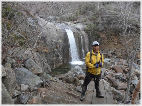 법천계곡으로 빠른 하산을 합니다. 재너머 형님은 산을 오를 때만 호흡에 약간의 문제가 있었지만 하산에는 아무런 문제가 없습니다. 칼바위를 약간 지나서 법천골 계곡 끝 지점의 계곡에서 온몸을 물속에 담갔습니다. 계절상 약간 빠른 알탕입니다. 물 속에서 5초를 버티면 사람 아닌 신입니다. 재너머 형님도 신 아닌 사람이었습니다.