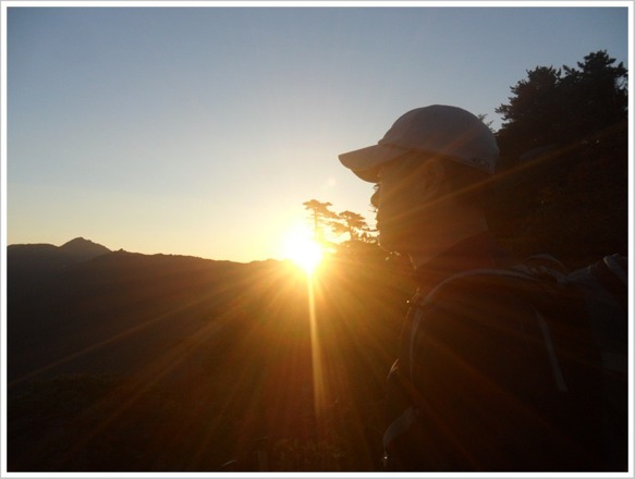 헤드랜턴 배터리가 다 닳은 현파트가 걱정되지만 별 문제는 없었습니다. 선비님께서 다소 못마땅하셨는지 선비샘 물을 뚝 끊었다 한참 후에 내려주십니다. 칠선봉을 지나고 영신봉 조금 못 미쳐 천왕봉과 촛대봉 사이의 주능선으로 아침 햇님이 머리를 쏙 밀어 올립니다. 지리산 종주하며 이곳에서는 처음 접하는 지리산 일출이지만 이곳에서의 일출 역시 감동입니다.
