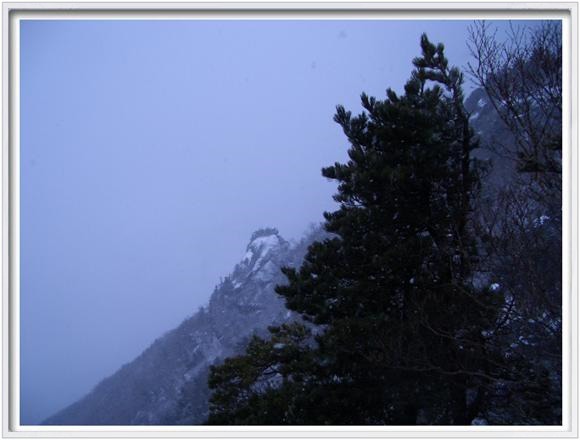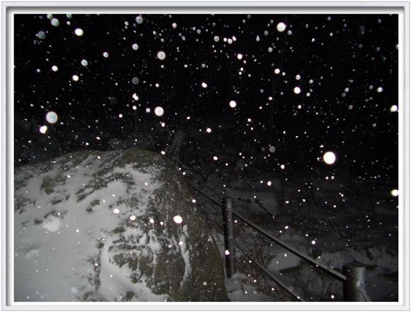 햇반과 라면으로 간단한 요기를 하고 스팻츠, 아이젠, 헤드렌턴등 산행준비를 야무지게 갖추고 산장 밖을 나서니 밤새 하이얀 눈들이 세상을 확 바꾸어 놓았습니다. 아침 7시가 되었어도 아직 눈빨이 날리는 캄캄한 한 밤중입니다.