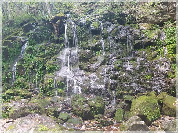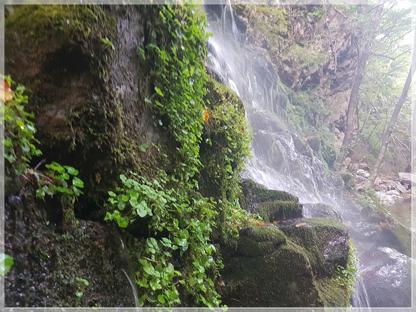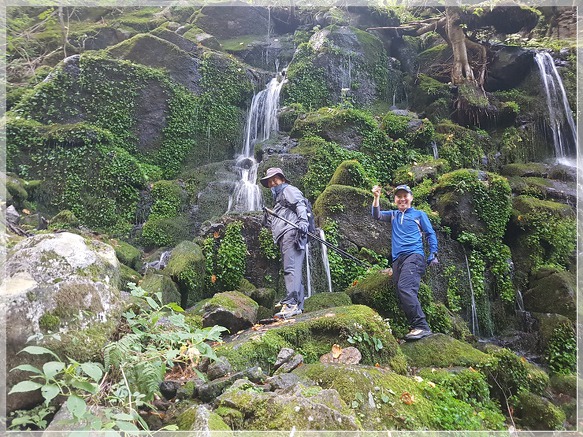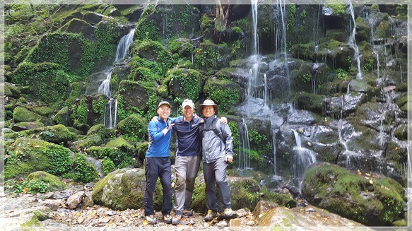 당연 묘향대에서 삼도봉 방향으로 이동하여 화개재를 통해 뱀사골계곡으로 하산해야 마땅하나 갑자기 이끼폭포가 궁금해졌습니다. 또 한번 미안함을 가지고 묘향대 아래 희미한 길을 따라 계곡을 내려갑니다. 한참을 내려가도 이끼폭포가 나오지 않아 길을 잘못 들었나 의심이 들 즈음 붉은 바람막이 옷을 입은 산님 한 분이 시야에 들어옵니다. 이 분 또한 뱀사골계곡에서 이끼폭포를 찾아 들어왔다가 길을 잘못 들었나 생각들 때 이끼폭포를 눈앞에서 발견했다 합니다. 덕분에 이끼폭포에서 단체사진을 찍을 수 있었습니다. 여름 끝자락 풍부하지 않은 수량으로 소문만큼이나 웅장하고 화려하진 않지만 이끼폭포 앞에 나 앙코가 섰다는 그 자체만으로도 엄청 기쁩니다.