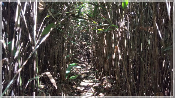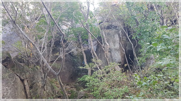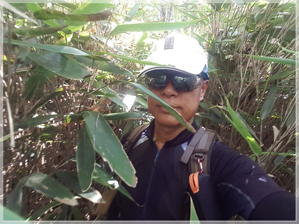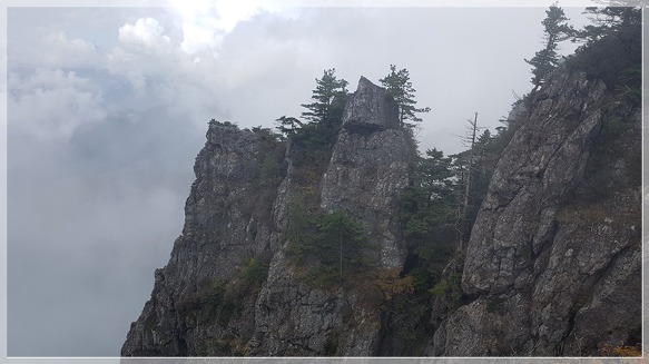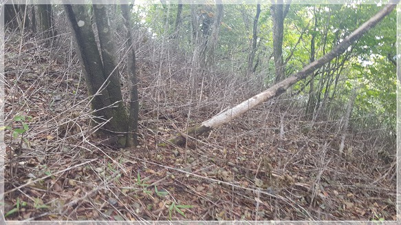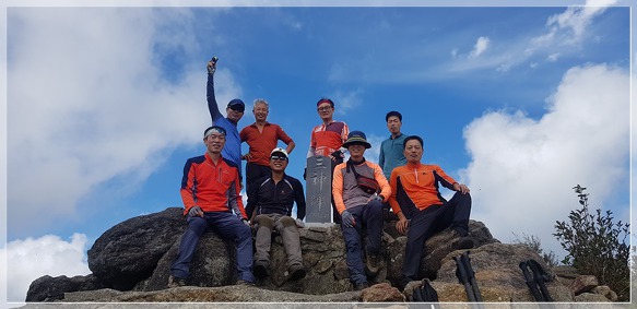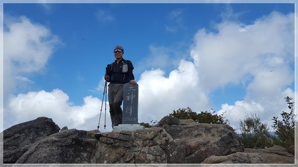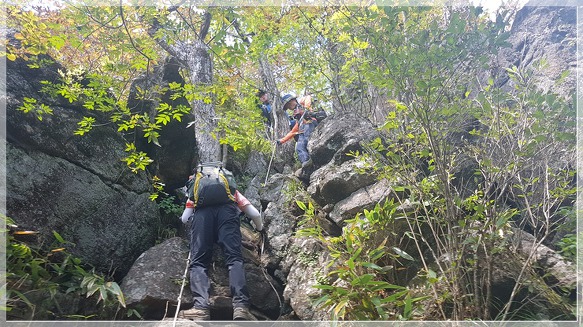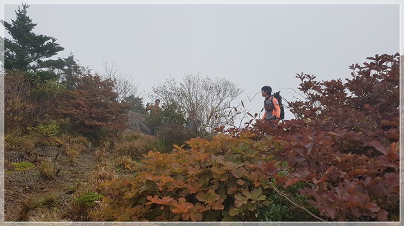 세 분 산님이 있어 단체사진도 남겨 봅니다. 그리고 비지정탐방코스인 외삼신봉 방향 등로로 진입합니다.외삼신봉 아래 험난한 암벽코스가 있습니다. 임시방편으로 누군가 가느다란 밧줄을 설치해 놓긴 했지만 사실 너무 위험합니다. 지난 낙남정맥 시절에도 이곳에서 애를 먹었는데 오랜 시간이 지난 지금도 그때나 별반 달라진 건 없습니다. 이제 서서히 산죽밭이 나오기 시작합니다. 바로 아래 묵계마을 주민들이 그랬는지 산죽밭 한가운데로 넓게 길을 만들어 놓았습니다. 앞서 세 사람의 대간팀 일행이 지나갔기에 무심코 그 길을 따라 내려가다 보니 그럴 리가 없는데 이상하게 거미줄이 얼굴에 착착 감깁니다. 이상하면 바로 빽 입니다. 약 30미터 전 먼저 간 일행이 나뭇가지로 막아놓은 것을 무시한 채 그 밑으로 통과 했던 것이 화근이었습니다.지금부터 정리 안된 어마어마한 산죽 밭이 나옵니다. 머리를 처박고 앞으로 앞으로 진행합니다. 얼굴이며 목, 팔 할 것 없이 완전 생채기를 당합니다. 또 먼지는 왜 그리 많이 날리는지? 산죽 잎이 모가지를 타고 들어갑니다.