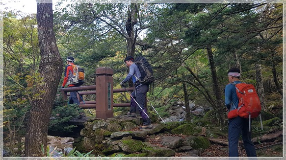 출발지 거림에서 간단이 체조로 몸을 풀고 있자니 갑자기 뱃속이 요동을 치기 시작합니다. 잠깐 화장실 다녀오는 사이 어느새 일행들의 모습은 사라지고 없습니다. 내 이럴 줄 알았습니다. 대간팀과 산행 할 때는 크든 작든 화장실은 금물임을 익히 알고 있지만 어쩔 수 없습니다. 간만의 장거리 산행인데 갑자기 앙코의 마음이 바빠지기 시작합니다. 천만다행으로 요즘 몸이 많이 불은 산타나 만수가 시야에 잡힙니다.불과 2개월전에도 난 이 길로 오른 적이 있습니다. 내가 생각할 때 지리산 주능선에 오르는 등로 중에서 가장 오르기 편한 길이 이곳 거림 코스인 것 같습니다. 그다지 힘들이지 않고 세석을 오르고 잠깐 숨을 돌린 후 영신봉에 오릅니다. 계절은 아직 이른 가을이건만 지리산의 고도가 워낙 높다 보니 세석은 벌써 단풍잔치가 시작되어 있습니다. 일부 몇몇 일행들은 영신봉 정상을 궁금해 하지만 올라가지 말라는 곳이니 그냥 주능선 길가에서 신백두대간 산행을 시작한다는 작은 퍼포먼스를 거행하고 곧 바로 신백두대간 종주를 위해 정상 맞은 편 방향으로 걸음을 옮깁니다.