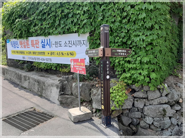 거제 복개천에서 옥산금성 방향으로 올라가곤 있지만 계룡산 등산로 이정표는 보이지 않습니다. 텃밭 가꾸는 아저씨에게 물어보니 거제저수지 뚝방을 건너면 등산로가 있다 일러줍니다.