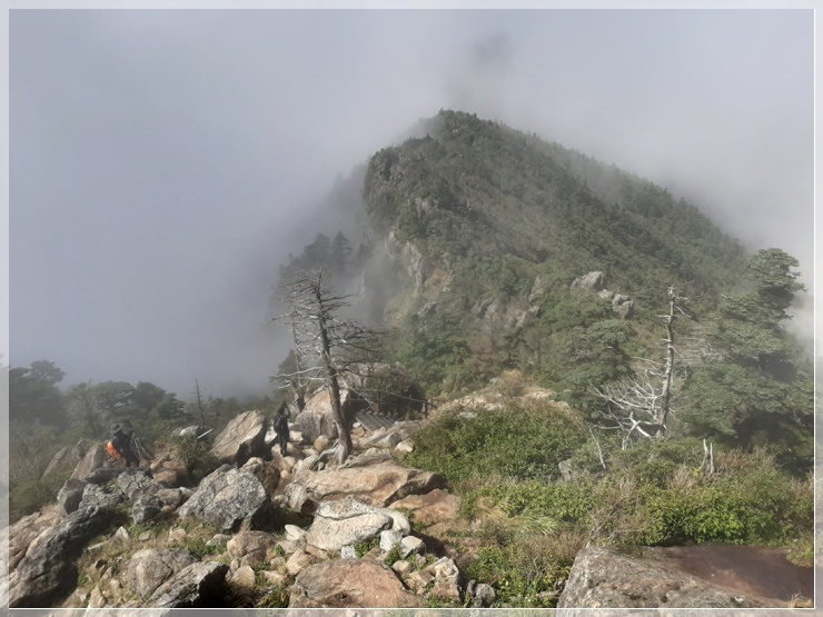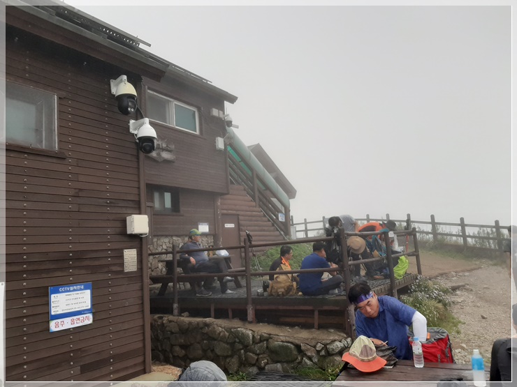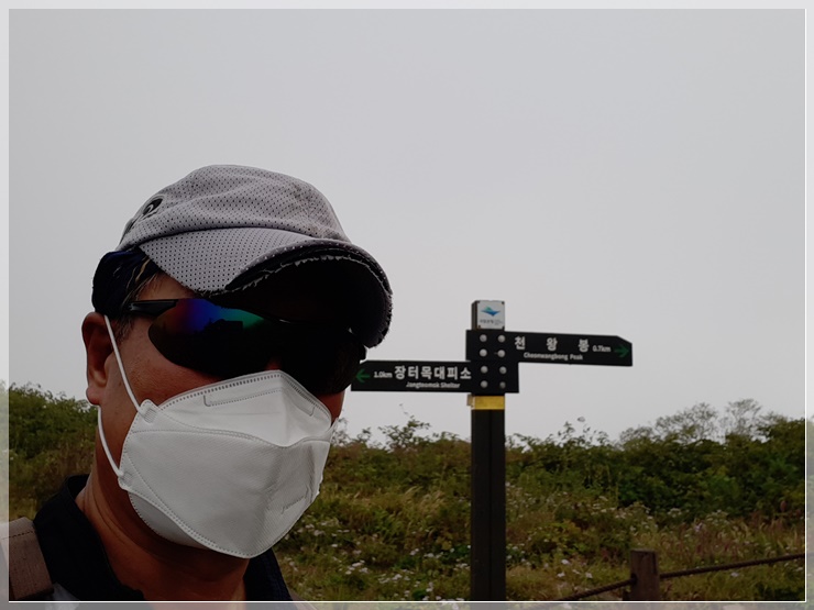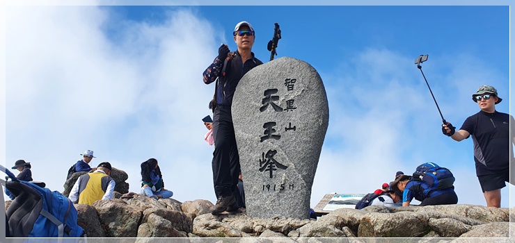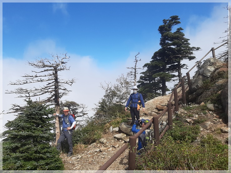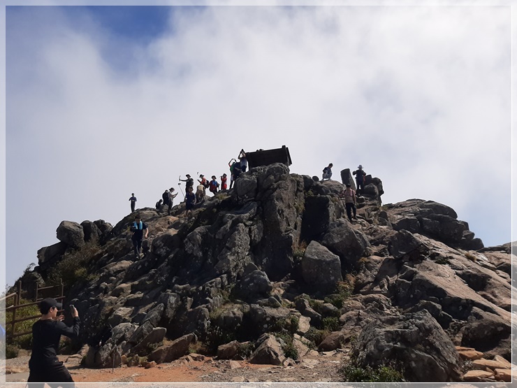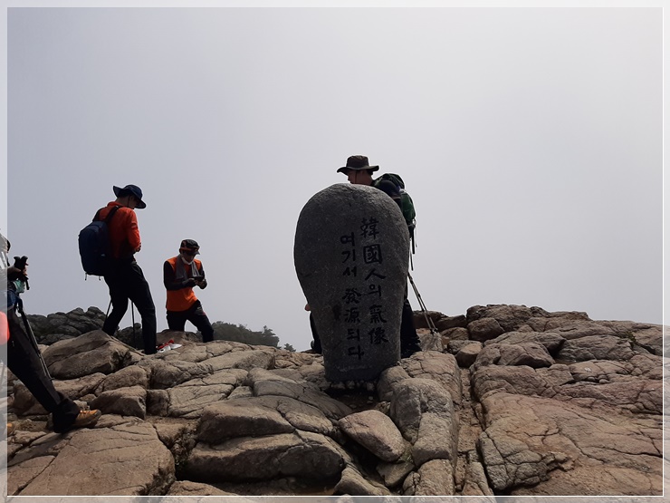 천왕봉 정상석에서 어느 산님들의 사진을 찍어 주던 나 앙코의 실수가 나옵니다. 정상석을 중심으로 젊은 남성 2분을 사이에 두고 흰 수건을 뒤집어 쓴 여성 1분이 가운데 섰습니다. 그런데 여성분이 정상석에 가려 얼굴만 반 앵글에 잡힙니다.