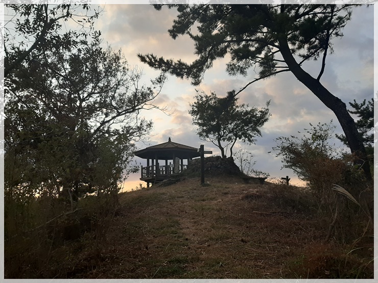 옥녀봉 정상 도착했지만 아직 해가 넘어가기엔 하늘이 많이 남았습니다. 정상에서는 석양 조망에 좋은 명당자리가 없어 올랐던 길을 되돌아 내려가다 우측편에 희미한 길이 있어 이동해 보니 석양 조망에 안성맞춤인 좋은 공터가 있습니다.