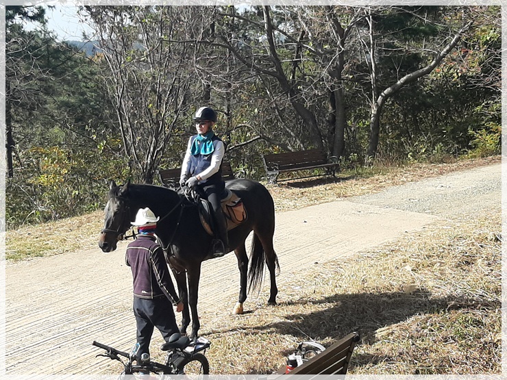 정골재에 잠깐 휴식을 취하는데 재미있는 광경이 눈앞에서 진행됩니다. 산악자전거 타시던 한 분이 나타나고 이어서 반대편에서 흑마에 승마한 사람이 나타나더니 뭔가를 그분께 전달해주고 사라집니다. 김밥 같은데 승마 배달인가 봅니다. 역시 대한민국 국민은 배달민족답습니다.